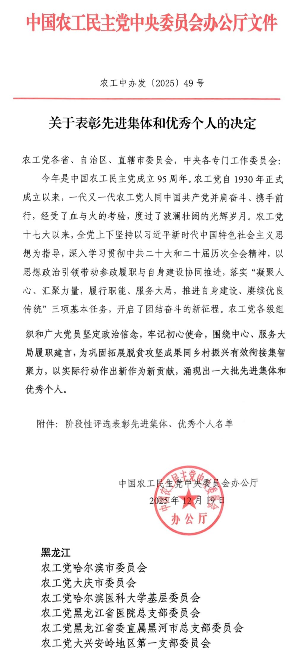 近日,中国农工民主党中央委员会公布阶段性评选表彰名单,农工党哈尔滨医科大学基层委员会荣获“基层组织先进集体”奖。这一荣誉是农工党中央对农工党哈医大基层委员会在自身建设、参政履职、服务社会等方面工作成效的充分肯定,也是学校统一战线工作围绕中心、服务大局取得的又一重要成果。