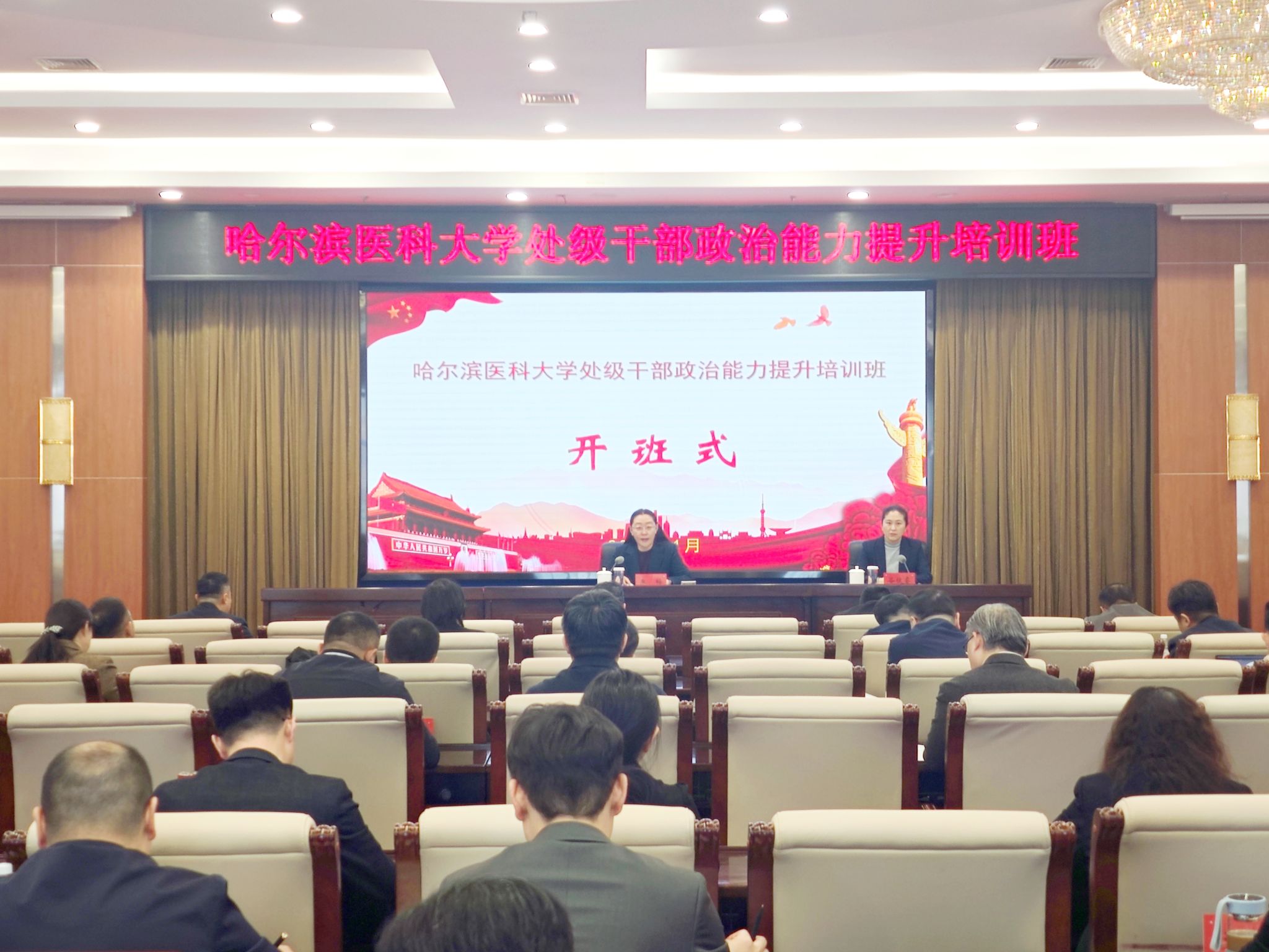 1月17日至19日,学校党委在中共黑龙江省委党校(黑龙江省行政学院)举办2026年第一期处级干部政治能力提升培训班。学校党委副书记东梅出席开班式并作动员讲话。学校党委常委、组织部部长谷佳睿出席结业式并作总结讲话。全校部分处级干部、人才、科级干部共计45人参加培训。