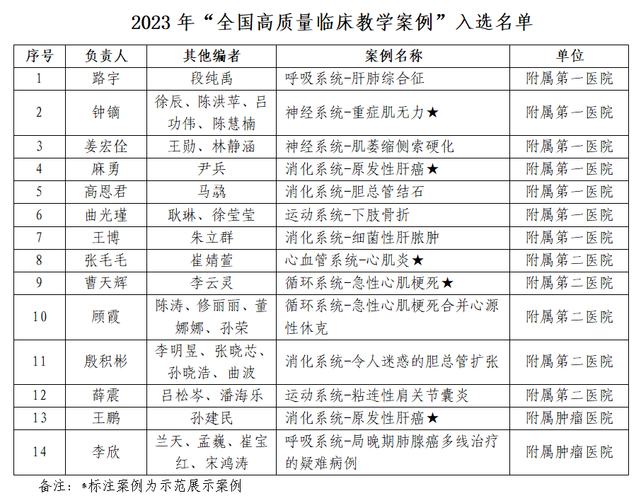 近日,中华医学会医学教育分会、全国医学教育发展中心联合发布《关于公布2023年“全国高质量临床教学案例”入选名单的通知》。经资格审查、专家会议评审、评审委员会核定及公示,我校共14项案例成功入选。其中5项被遴选为“示范展示案例”,已被全国医学教育发展中心纳入“中国医学教育案例库”,面向全国高校推广使用。