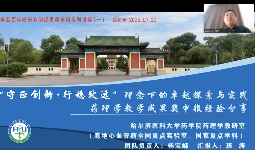 随后,药学院副院长班涛教授以“‘守正创新・行稳致远’理念下的卓越探索与实践”为题,分享了药理学领域教学成果申报的实战经验。班涛教授结合省教学成果特等奖等经历,从“痛点挖掘-方案设计-团队搭建-成果凝练”全流程展开,系统梳理了成果凝练和撰写的核心逻辑,体现了深厚的教学积淀和前瞻性思考。
