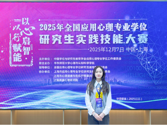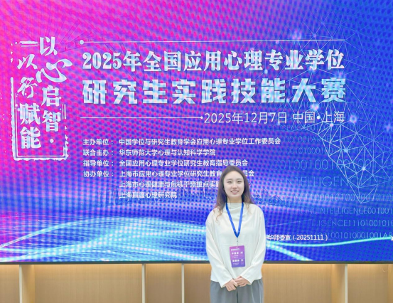 12月7日,由中国学位与研究生教育学会应用心理专业学位工作委员会、华东师范大学联合主办,全国应用心理专业学位研究生教育指导委员会指导的2025年全国应用心理专业学位研究生实践技能大赛决赛在上海举行。我校心理科学与健康管理中心应用心理专硕共5名同学在三大核心赛道斩获佳绩。作为国内应用心理领域最具权威性的专业赛事,本年度大赛吸引了来自全国146所高校的641支应用心理专业研究生队伍同台竞技。