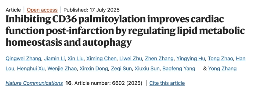 近期,学校寒地心血管病全国重点实验室杨宝峰院士团队张勇教授课题组在心肌梗死研究领域取得新进展,研究成果《inhibiting cd36 palmitoylation improves cardiac function post infarction by regulating lipid metabolic homeostasis and autophagy》被国际知名期刊《naturecommunications》收录并正式发表。