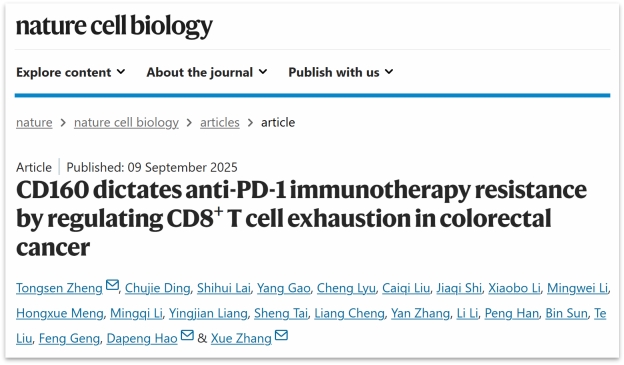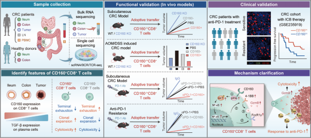 近日,哈尔滨医科大学“疾病基因及分子靶点创新研究”头雁团队的郑桐森-郝大鹏联合团队在肿瘤免疫治疗领域取得重要进展,研究论文《cd160 dictates anti-pd-1 immunotherapy resistance by regulating cd8 t cell exhaustion in colorectal cancer》于9月9日在线发表(nature cell biology,2025)。研究团队首次发现一种在回肠中特异富集的cd160 cd8 t细胞亚群兼具强大的抗肿瘤细胞毒性与抗终末耗竭功能,并能有效克服pd-1单抗治疗耐药,为肠癌患者提供了全新治疗策略。