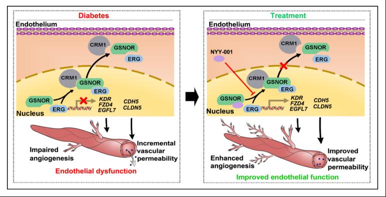 gsnor是亚硝基谷胱甘肽(gsno)代谢的关键酶,在调控细胞内一氧化氮和蛋白质巯基亚硝基化修饰的稳态平衡中发挥关键作用,但是其在糖尿病血管内皮功能障碍中的作用尚未明确。本研究通过蛋白质组学筛选发现,gsnor在糖尿病患者及糖尿病模型动物的血管内皮细胞中表达显著升高。而内皮细胞特异性敲除gsnor可促进糖尿病小鼠缺血侧肢的血流恢复和血管新生,并改善血管通透性和舒张功能。进一步机制研究表明,gsnor通过核输出蛋白crm1依赖的通路,介导转录因子erg的出核转运,进而抑制erg下游血管稳态相关基因的表达,从而导致血管内皮功能障碍。该作用不依赖于gsnor的酶活功能,基于该机制,研究团队设计并合成了全新的小分子化合物—nyy-001,该化合物具备良好的口服吸收效果和安全性,可有效阻断gsnor与erg的结合,促进糖尿病小鼠缺血下肢的血流恢复和血管新生情况,并改善血管通透性。