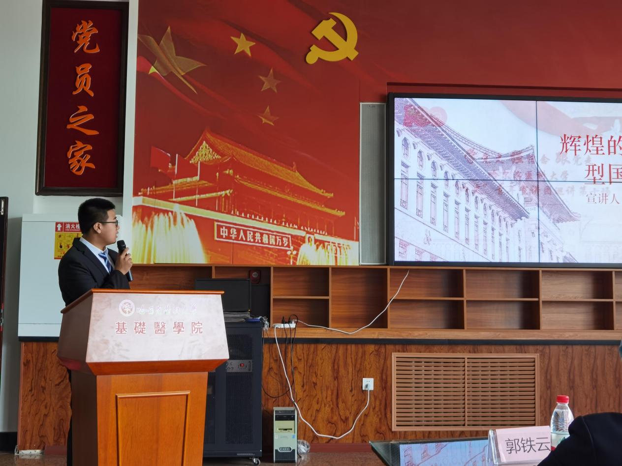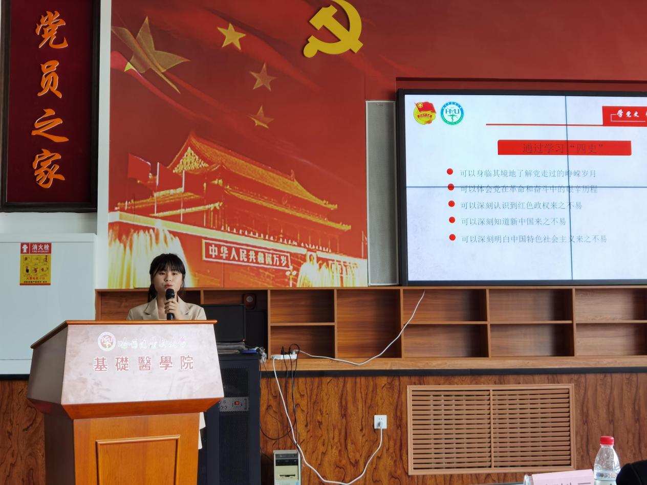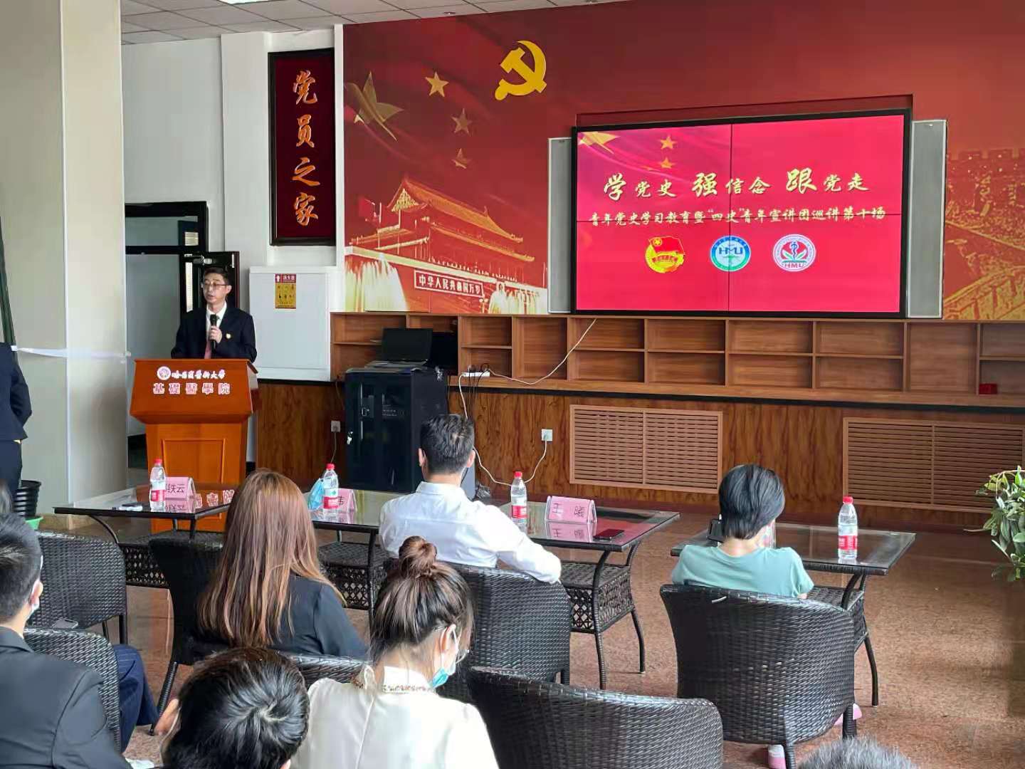 2021年6月25日上午,校团委与基础医学院团委联合开展的“学党史、强信念、跟党走”暨哈尔滨医科大学“四史”青年宣讲团第十场巡讲于基础医学院三楼会议厅召开。校团委书记王曦、基础医学院副院长朱骥伟、“四史”青年宣讲团指导教师姜欢、基础医学院团委书记郭铁云、以及多名教师代表、学生代表出席本次活动。