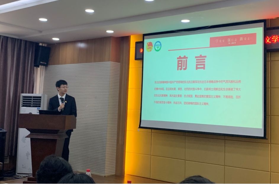 公共卫生学院2020级预防医学专业高一森的宣讲主题是《追忆红色历史,铭记抗联精神》,向我们讲述了,东北抗联精神不仅是中国抗战史上气贯山河的英雄史诗和华彩乐章,是中华民族自强不息、百折不挠的革命精神的彪炳彰显,是人类为了正义事业挑战自身极限的传奇典范,更是始终鼓舞中华民族实现伟大复兴的强大精神动力。东北抗联精神成为中华民族宝贵的精神遗产,是我们取之不尽,用之不竭的力量源泉。