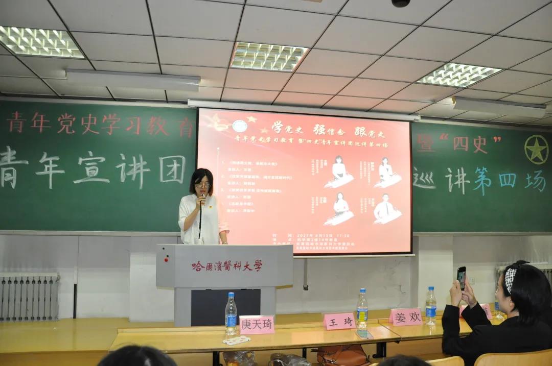 活动开始,药学院团委书记王琦老师为宣讲会致辞并讲话。她首先十分感谢校宣讲团的指导老师和成员代表能够受邀来到药学院开展宣讲活动,她鼓励号召同学们要学习党史,重温党的百年奋斗历程,提升自己面对未知困难的勇气;要学会爱党爱国,直面自己未来的人生;要把握好时代契机,明确自己的时代使命,勇于接受时代挑战,闯出自己的一片天地。