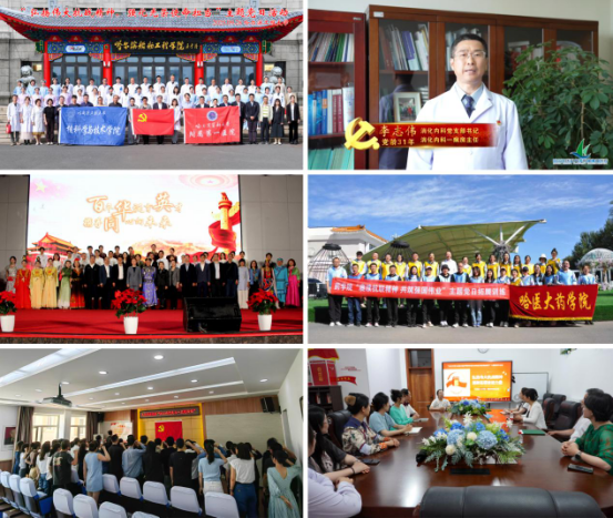 通过讲授专题党课、参观红色教育基地、重温入党誓词等方式,引导党员师生深刻领悟党的创新理论,从党的百年奋斗历程和学校百年办学历史中汲取智慧力量。附属一院党委联合哈尔滨工程大学核科学与技术学院和校医院党委,举办“弘扬伟大抗战精神,强化光荣使命担当”主题党日活动,双方党委书记分别讲授“红色基因”专题党课,展现新时代党员赓续红色基因、践行初心使命的文化底蕴和使命坚守。附属三院党委精心策划“党旗下·话初心——支部书记对党说”系列视频,不同党龄、不同岗位的支部书记在视频中表达对党和国家的真挚祝福。基础医学院党委开展“庆七一·颂党恩·迎建校百年华诞”系列活动,举办“百年华诞育英才 携手同心向未来”师生文艺汇演,以艺术为笔勾勒百年校史与祖国发展同频共振的峥嵘岁月。药学院党委开展“喜迎祖国华诞,赓续抗联精神”拓展训练,由党委书记讲授“开学第一堂红色党课”,在全体新生中开展“迎国庆”主题早演讲活动,引导党员师生感悟革命精神,共庆祖国华诞。人文学院党委组织新老党员进行入党宣誓,全体师生合唱《没有共产党就没有新中国》,选派选手参加全省“红色传承·光耀黑土”主题演讲大赛,荣获二等奖。马克思主义学院党委组织“世界反法西斯胜利80周年”专题组织生活会,结合马克思主义理论剖析反法西斯胜利的历史必然性,切实将红色基因融入思政课堂。