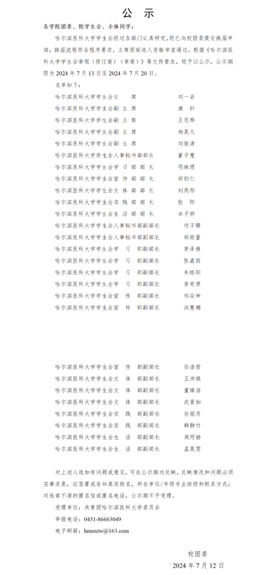 7月12日上午,哈尔滨医科大学学生会于主楼三楼报告厅召开2024年上半年述职评议会。本次大会得到了学校党委与团委的高度重视与大力支持,学生处张诗曼老师、校团委苗新秀楠老师、韩悦老师出席本次会议。会议由校学生会主席刘一岩主持。