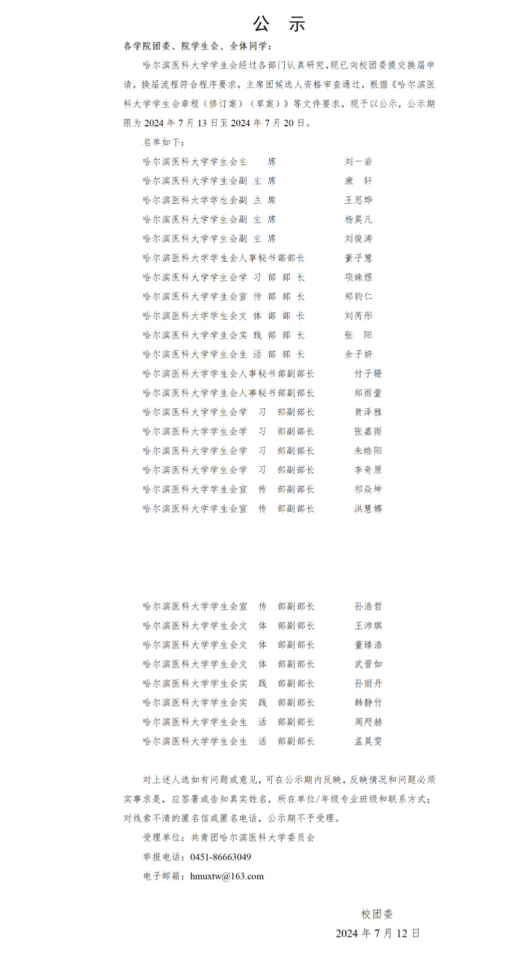 哈尔滨医科大学学生会经过各部门认真研究,现已向校团委提交换届申请,换届流程符合程序要求,主席团候选人资格审查通过,根据《哈尔滨医科大学学生会章程(修订案)(草案)》等文件要求,现予以公示。