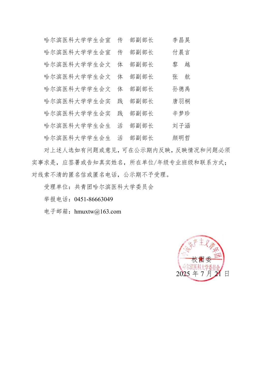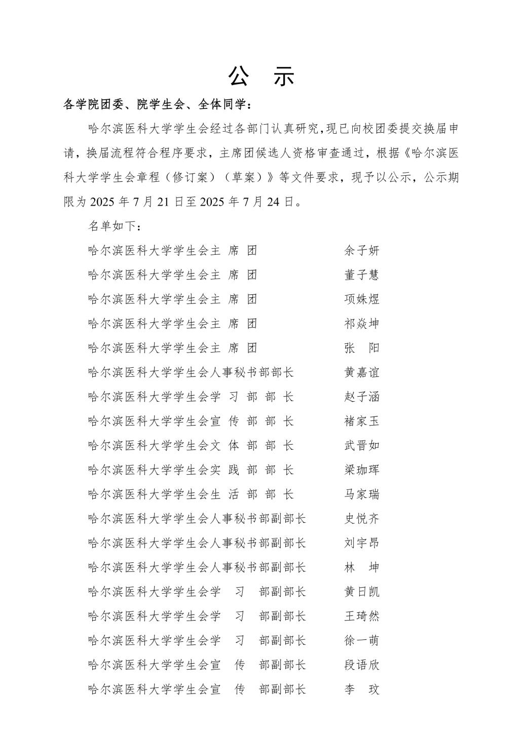 哈尔滨医科大学学生会经过各部门认真研究,现已向校团委提交换届申请,换届流程符合程序要求,主席团候选人资格审查通过,根据《哈尔滨医科大学学生会章程修订案(草案)》等文件要求,现予以公示。