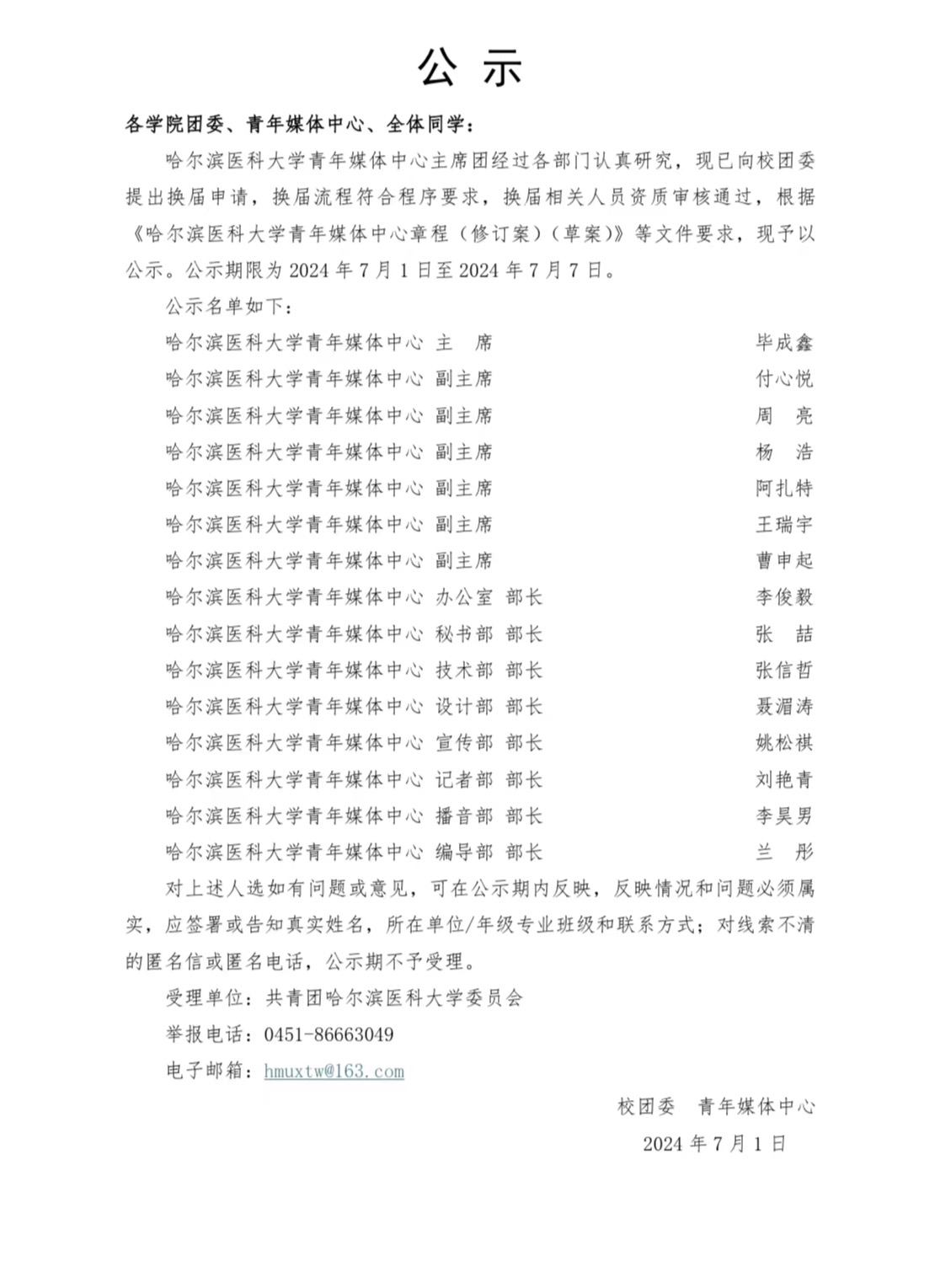 哈尔滨医科大学青年媒体中心主席团经过各部门认真研究,现已向校团委提出换届申请,换届流程符合程序要求,相关人员资格审查通过,现予以公示。