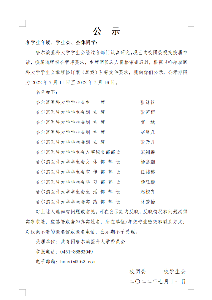 哈尔滨医科大学学生会经过各部门认真研究,现已向校团委提交换届申请,换届流程符合程序要求,主席团候选人资格审查通过,根据《哈尔滨医科大学学生会章程修订案(草案)》等文件要求,现予以公示。