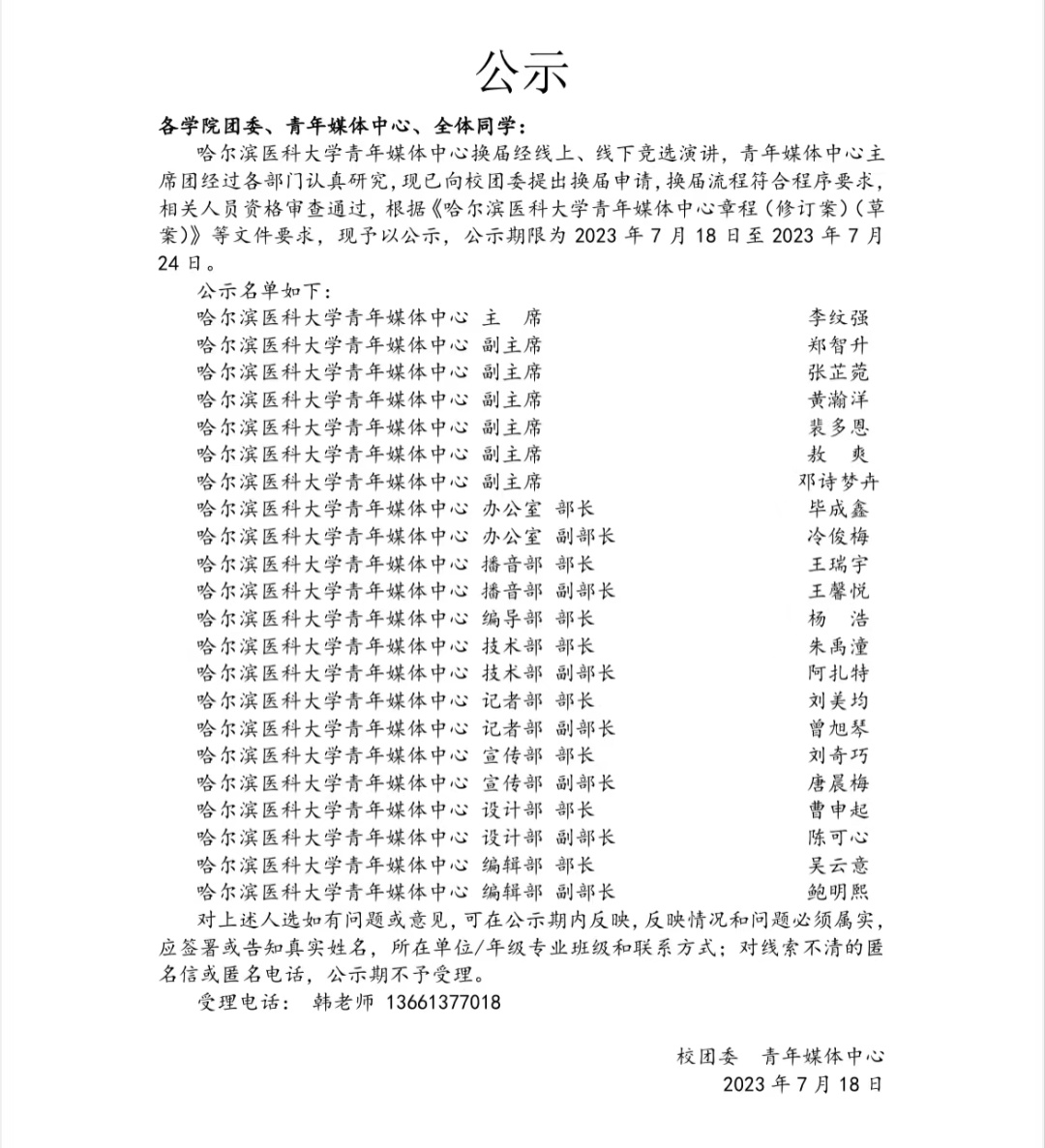 哈尔滨医科大学青年媒体中心主席团经过各部门认真研究,现已向校团委提出换届申请,换届流程符合程序要求,相关人员资格审查通过,现予以公示。