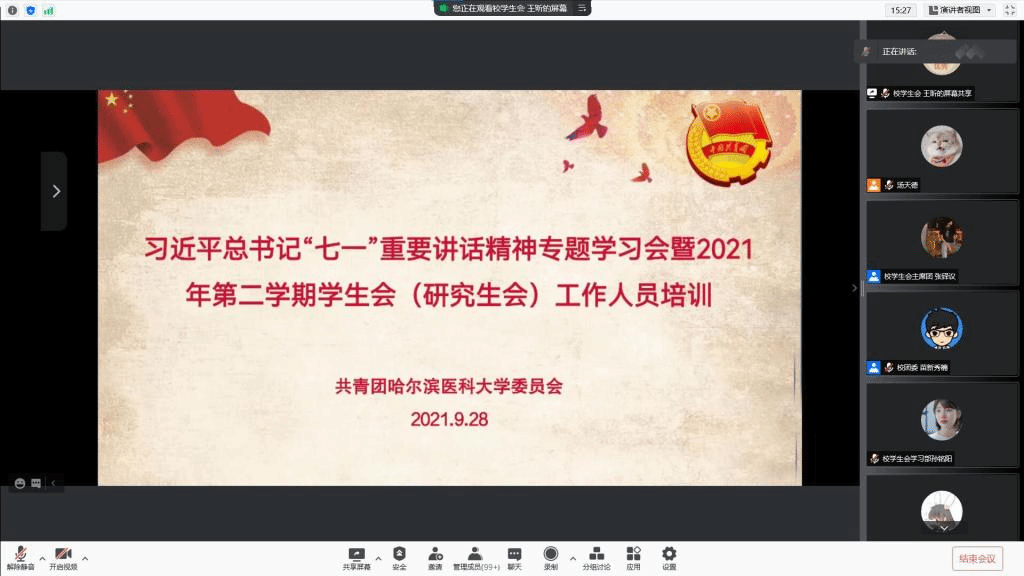 为深入贯彻习近平总书记关于青年工作的重要思想,进一步深化学生会改革,支持和引导学生会更好地服务青年学生成长成才,提高学生会工作人员的综合素质,加强学生组织的凝聚力和战斗力。9月28日晚,我校在线上召开习近平总书记“七一”重要讲话精神专题学习会暨2021年第二学期学生会(研究生会)工作人员培训。哈尔滨医科大学学生会、研究生会全体工作人员参加本次培训。会议由校团委苗新秀楠老师主持。