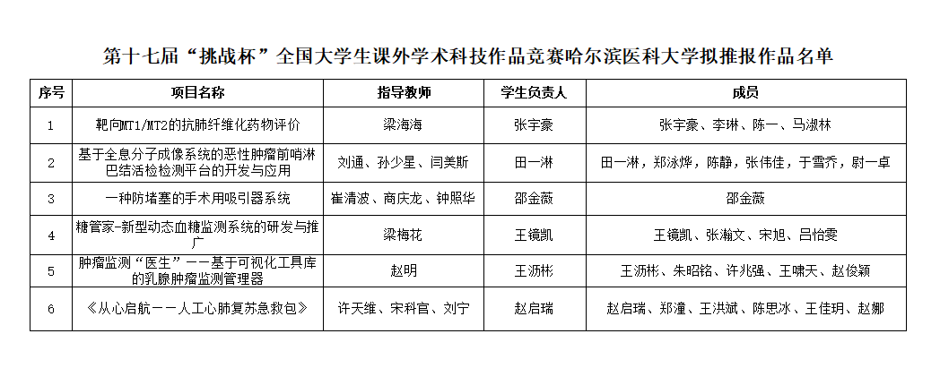 哈尔滨医科大学推报第十七届“挑战杯”全国大学生课外学术科技作品竞赛项目