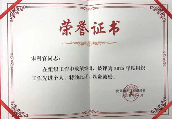 近日,民革黑龙江省委员会发布《关于表彰民革黑龙江省2025年度组织工作先进市级组织、先进集体、先进个人的决定》,对一年来在各项工作中表现突出的集体与个人予以表彰。我校民革省直哈医大委员会荣获“2025年度民革省委社会服务工作先进集体”称号,民革省直哈医大二院支部荣获“2025年度民革省委组织工作先进集体”称号,民革省直哈医大委员会主委宋科官荣获“2025年度民革省委组织工作先进个人”称号。