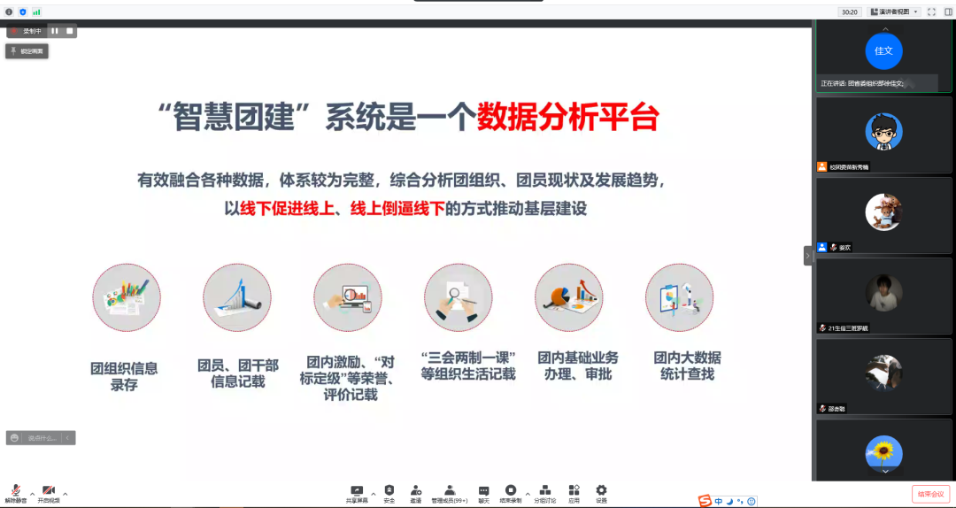 在本次培训中,徐佳文老师对“智慧团建”系统进行了全面的介绍以增强大家的了解,结合“学社衔接”“团内激励”“对标定级”等重点工作讲解了使用智慧团建的流程及相关功能操作,同时也对基层团组织存在的共性问题及解决办法为大家进行一一解答。