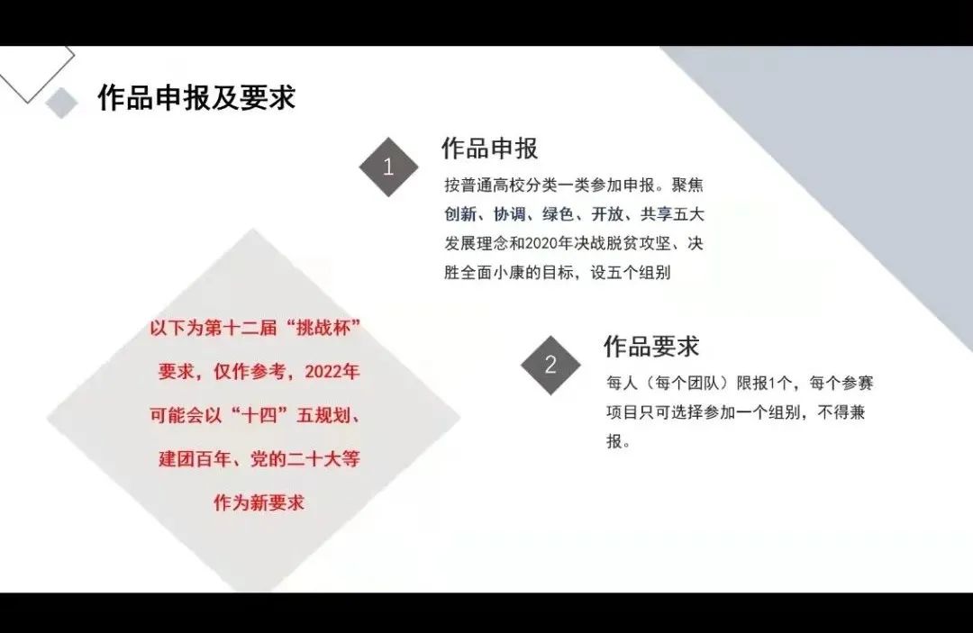 会上,团委书记王琦副教授为参会师生介绍了“挑战杯”的相关要求和注意事项,她分别从参赛资格及参赛形式、赛事流程、作品申报及要求和奖励政策四个方面对“挑战杯”赛事进行了基础全面的讲解。王琦书记表示“挑战杯”竞赛在锻炼大学生创新创业思维,培养创新创业意识方面具有重要作用,学院团委也会充分调动资源,全方位给予作品支持。