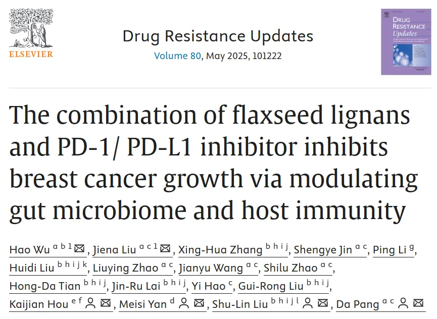 近日,哈尔滨医科大学附属肿瘤医院研究人员与我院基因组中心刘树林教授团队合作,在膳食成分调控乳腺癌免疫治疗研究领域取得重要突破。相关研究论文《the combination of flaxseed lignans and pd-1/pd-l1 inhibitor inhibits breast cancer growth via modulating gut microbiome and host immunity》于2025年5月在国际顶级期刊《drug resistance updates》(中科院一区,if=21.7)正式发表。该研究为破解乳腺癌免疫治疗耐药难题提供了全新靶点。