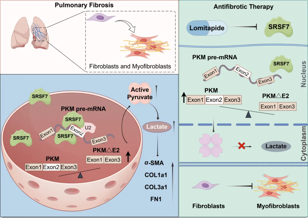 在本研究中,研究者发现剪接因子srsf7在ipf患者与肺纤维化动物模型中表达均显著上调,并显著富集于肺成纤维细胞。进一步研究表明,srsf7能够促使丙酮酸激酶编码基因pkm发生异常可变剪接,而剪接异构体pkmδe2的生成可以促使成纤维细胞发生代谢重编程,进而驱动肺纤维化进展。基于以上背景,团队通过对fda小分子化合物进行系统性筛选,发现降脂药物lomitapide能够有效抑制srsf7的表达,缓解博来霉素诱导的小鼠肺纤维化。该研究首次揭示了srsf7诱导肺成纤维细胞代谢失调的分子机制,同时为肺纤维化的治疗药物研发工作提供了重要的理论支持和潜在靶点。