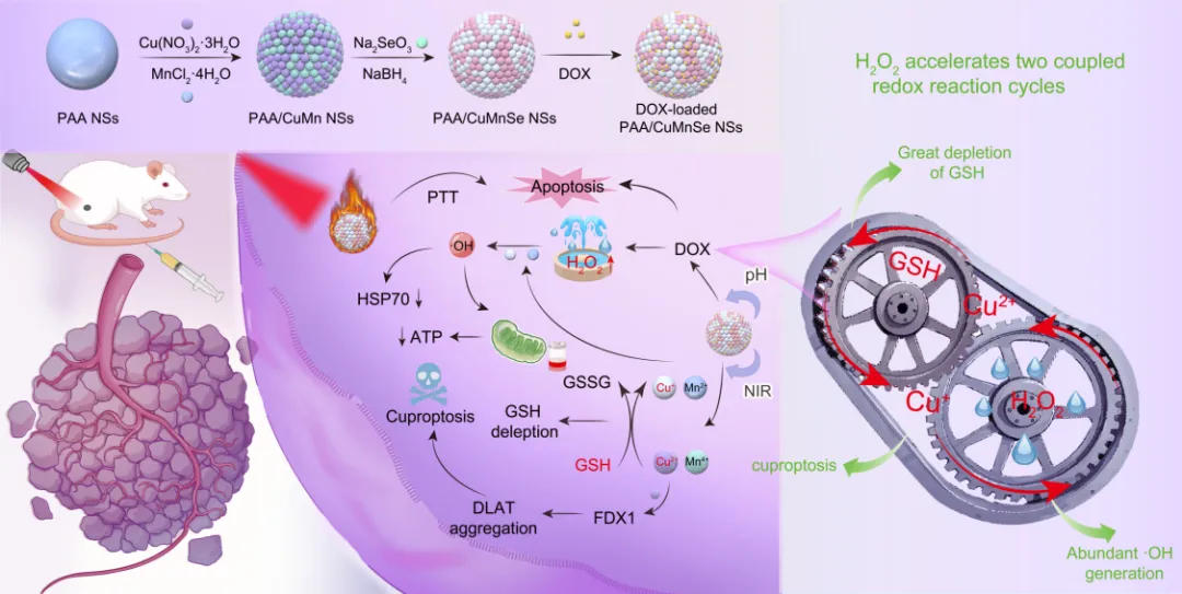 针对当前肿瘤治疗中单一疗法效果有限的挑战,团队致力于开发多模式协同策略,课题组开发了聚丙烯酸/铜锰硒(paa/cumnse)纳米粒子实现了对化疗药物阿霉素(dox)的高效负载(载药量为49%),实现“三管齐下”。该载体高效递送化疗药阿霉素(dox)至肿瘤微环境(tme),并利用dox在肿瘤内原位产生的(h₂o₂)驱动“三管齐下”的协同治疗机制。纳米粒中的铜/锰离子通过耦合的氧化还原循环,协同驱动“铜死亡”(加速关键蛋白dlat聚集),提高类芬顿效应增强cdt,并叠加dox自身的化疗效果。体外和体内实验证明,通过化疗-铜死亡-cdt三重协同策略能够显著提升抗肿瘤效果。