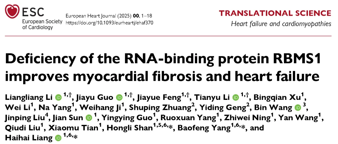 近日,我院寒地心血管病全国重点实验室杨宝峰院士团队梁海海课题组在心力衰竭分子机制研究方面取得重要进展。课题组发现rna结合蛋白rbms1通过调控可变剪接过程促进心力衰竭进展,研究成果《deficiency of the rna-binding protein rbms1 improves myocardial fibrosis and heart failure》被国际顶级心血管期刊european heart journal(影响因子38.1)收录并正式发表。该研究由李亮亮博士后、国佳钰博士、冯佳悦硕士、李天宇副研究员作为共同第一作者完成。