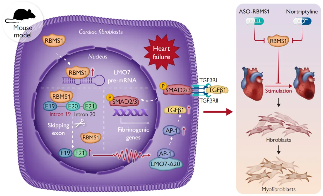 课题组通过临床样本分析发现,rbms1在心力衰竭患者心脏组织中表达升高。采用条件性基因敲除技术证实,成纤维细胞特异性敲除rbms1可显著缓解心衰小鼠的心肌纤维化并改善心脏功能障碍。通过整合rna-seq、分子生物学和转基因动物等多种技术手段,课题组首次阐明rbms1通过调控lmo7基因第20号外显子的可变剪接,形成lmo7-δe20剪接异构体,进而激活 ap-1/tgf-β信号通路。更值得关注的是,该课题组发现临床用药去甲替林和特异性反义寡核苷酸靶向干预rbms1可有效改善心衰小鼠心脏功能,为临床转化提供了潜在治疗策略。