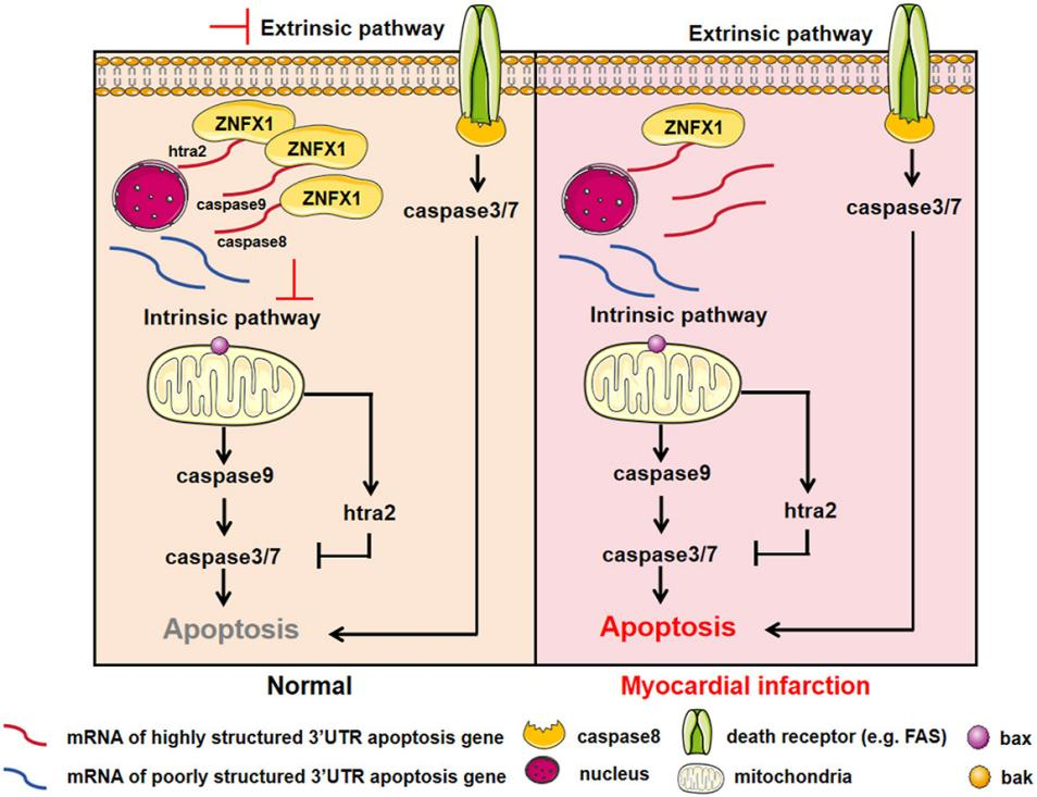 在本研究中,课题组发现,znfx1在心肌梗死心肌组织及缺氧处理的心肌细胞中表达降低。在小鼠模型中,过表达znfx1可显著减轻由心肌梗死引发的心脏功能障碍、缩小梗死面积、抑制胶原沉积并缓解心脏肥大;而敲低znfx1则产生相反效应。机制研究表明,znfx1通过降解具有高度结构化3′utr的凋亡相关基因mrna,在心肌梗死中发挥保护作用。该研究首次发现znfx1调控细胞凋亡的选择性和特异性分子机制,为程序性细胞死亡的调控机制提供了新见解,并有望为以凋亡为核心病理环节的疾病揭示新的治疗干预靶点。