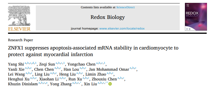 近日,我院寒地心血管病全国重点实验室张勇教授课题组在心肌梗死研究领域取得新进展,研究成果《znfx1 suppresses apoptosis-associated mrna stability in cardiomyocyte to protect against myocardial infarction》被国际期刊redox biology收录并正式发表。